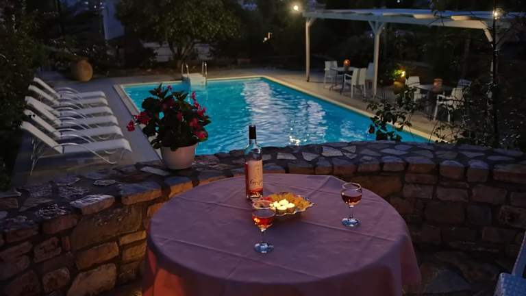 Jede klimatisierte Villa verfügt über einen Balkon mit Essbereich unter freiem Himmel, der Platz für bis zu 6 Personen bietet und einen Ausblick auf das Meer sowie die Altstadt und den Hafen gewährt. Die Küche ist mit einem Herd, einem Kühlschrank und einer Essecke ausgestattet.