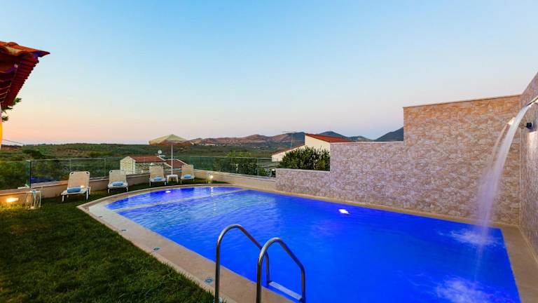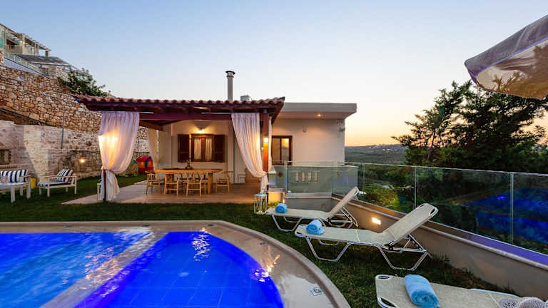 Die Villa bietet eine Terrasse mit Bergblick und umfasst eine gut ausgestattete Küche, zwei Badezimmer sowie Satelliten Flachbild-TV. Weitere Annehmlichkeiten sind kostenlose WLan-Nutzung und ein Whirlpool.
