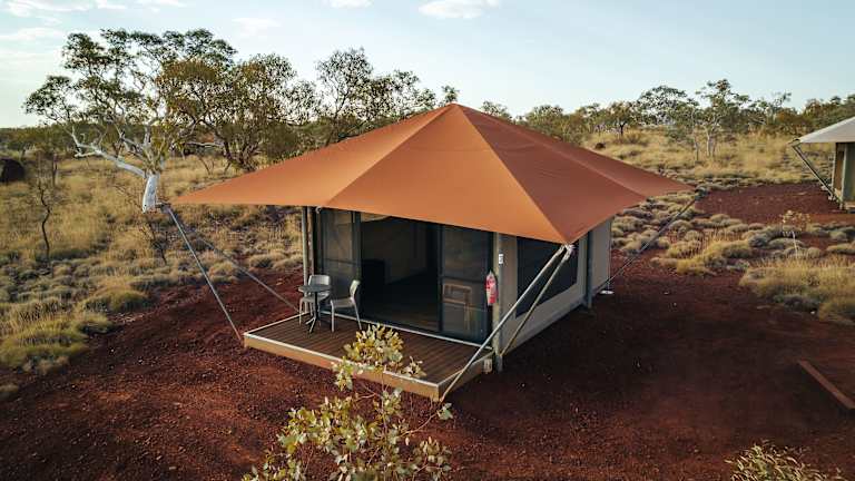 Das Karijini Eco Retreat ist eine ökologische und umweltfreundliche Unterkunft in der westaustralischen Region Pilbara. Die Unterkunft hat luxuriös eingerichtete Zelte, die mit qualitativ hochwertigen Betten und Bettwäsche ausgestattet sind. Jedes Zelt verfügt über ein eigenes Bad, eine vordere und hintere Terrasse sowie ein stilvolles und geräumiges Inneres. Das Retreat nutzt Sonnenenergie und die Böden bestehen aus recyceltem Holz.