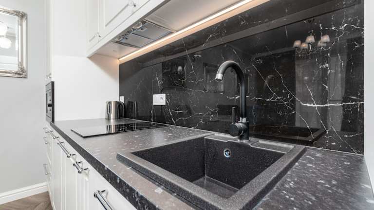 Die Ferienwohnung beinhaltet eine voll ausgestattete Küchenzeile mit Kühlschrank und Wasserkocher, ermöglicht somit Selbstverpflegung.