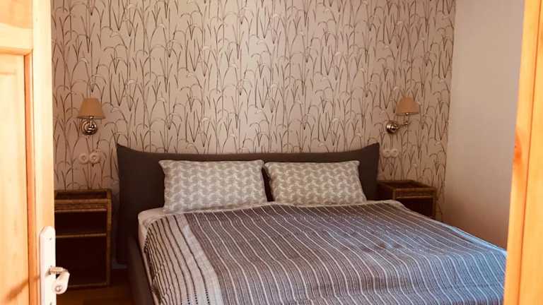 Die Ferienwohnung verfügt über ein Schlafzimmer sowie eine Küchenzeile, die mit einem Kühlschrank, Geschirrspüler und Kaffeemaschine ausgestattet ist. Handtücher und Bettwäsche werden zur Verfügung gestellt. Eine Terrasse ist ebenfalls vorhanden.