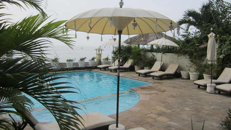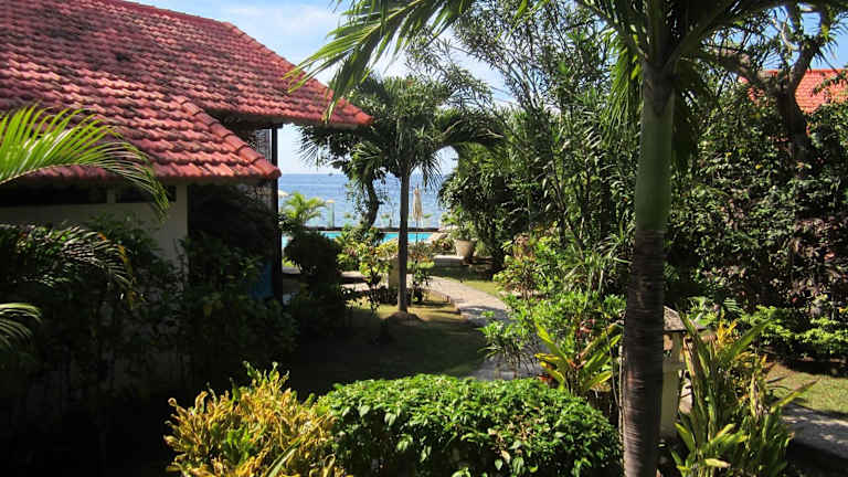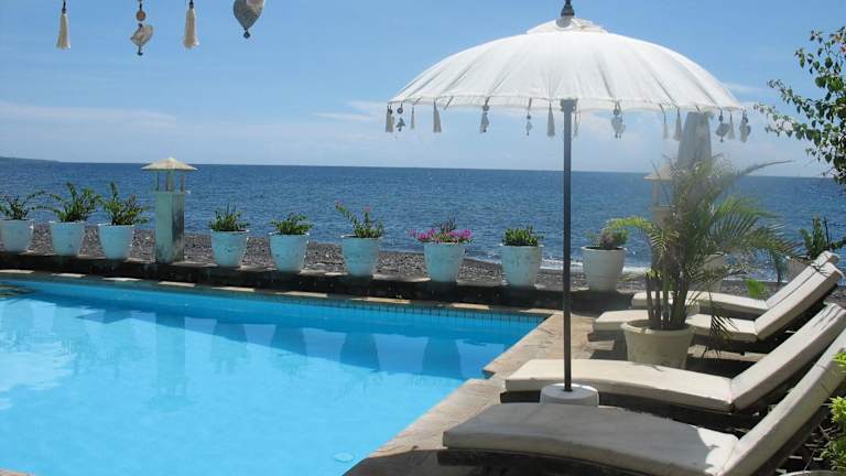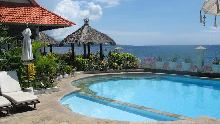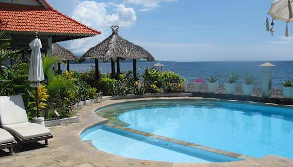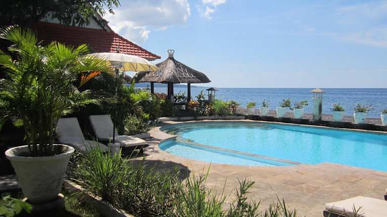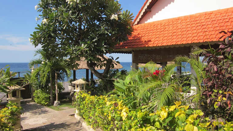 Die Kembali Beach Bungalows befinden sich in Amed im Nordosten von Bali und bieten eine atemberaubende Aussicht auf die Balisee und den Berg Gunung Agung. Die Unterkunft liegt direkt am Strand und ist von einem malerischen Garten umgeben.