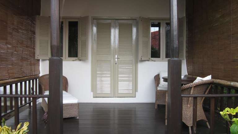 Die Bungalows sind gemütlich eingerichtet und bieten eine angenehme Sitzecke mit Blick ins Grüne. Die halb offenen Badezimmer sind mit einer Dusche ausgestattet, was den Gästen eine besondere Bequemlichkeit bietet.