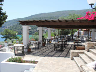 Das Hotel bietet Halbpension mit einem täglichen Frühstück von 07:30 bis 10:00 Uhr sowie einem gesetzten 3-Gänge Abendessen von 18:30 bis 21:00 Uhr an. Die Küche ist griechisch und mediterran und es stehen Snacks von 12:00 bis 16:00 Uhr, ebenfalls gegen Gebühr, zur Verfügung. Die Bar neben dem Pool serviert eine grosse Auswahl an Snacks, Getränken und Cocktails.