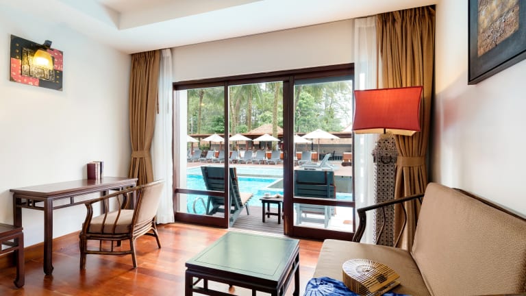 Die 32 Quadratmeter großen Zimmer im Khaolak Oriental Resort sind mit Möbeln im orientalischen Stil eingerichtet Jedes Zimmer verfügt über einen privaten Balkon, einen Tee- und Kaffeekocher und Sat-TV, kostenfreies WLAN im Zimmer, eine Minibar und einen Zimmersafe. Toilettenartikel inklusive Bademantel, Badetücher und Strandtücher. Deluxe Pool Access verfügt über eine private Terrasse mit direktem Zugang zum Pool.
