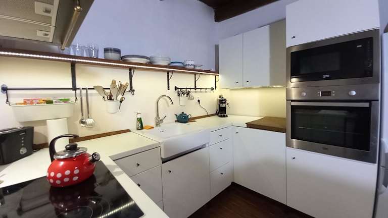 Die Ferienwohnung umfasst zwei Schlafzimmer, ein Wohnzimmer sowie eine gut ausgestattete Küche mit Kühlschrank und Geschirrspüler, die für Selbstversorger geeignet ist.