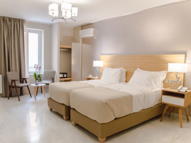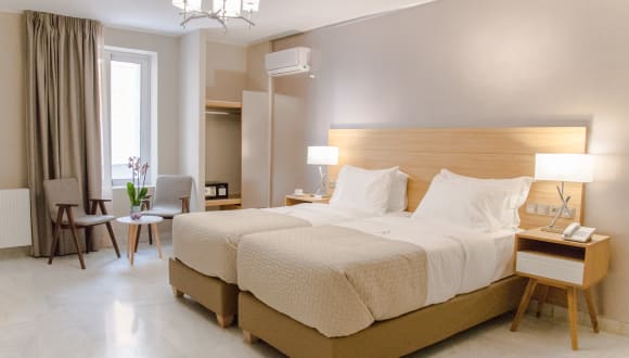 General: Elevator, Private Garden, No-smoking rooms, Heating, Air Conditioning, , flat screen TV, Mini-bar, Make-up Mirror, Hairdryer, En suite shower or bathtub, Balcony with garden view, Mastic-Spa Amenities. Languages spoken: English, Greek, French, Romanian Bedding: Hypoallergenic mattress (30cm wide) and pillows for an unbellievable sleeping experience. Food & Beverage: Bar, Snack Bar. Internet: Wi-Fi is available in lobby area and is free of charge. All rooms are equiped with In-Wall Wi-Fi Access Point and Ethernet plug. Parking: Street parking (subject to availability at the time of check-in). Services: 24 Hours Front Desk, Luggage storage, Daily maid service, Tour Desk, Fax / Photocopying, bicycle, moto and car rental.