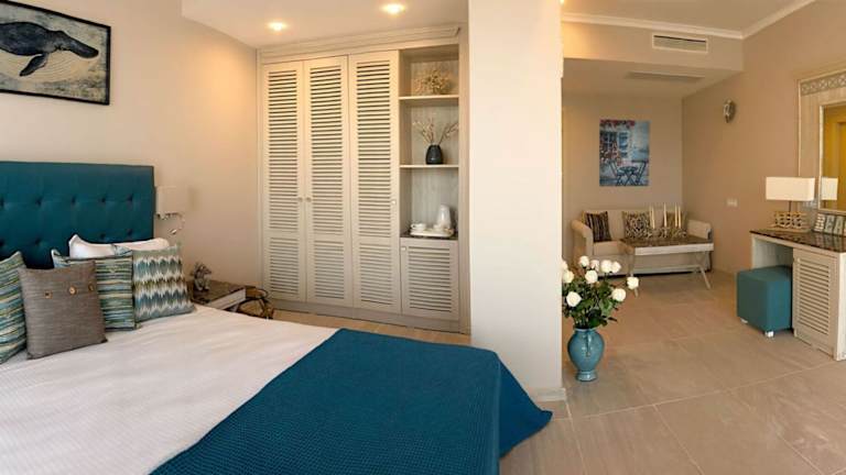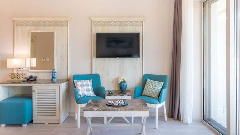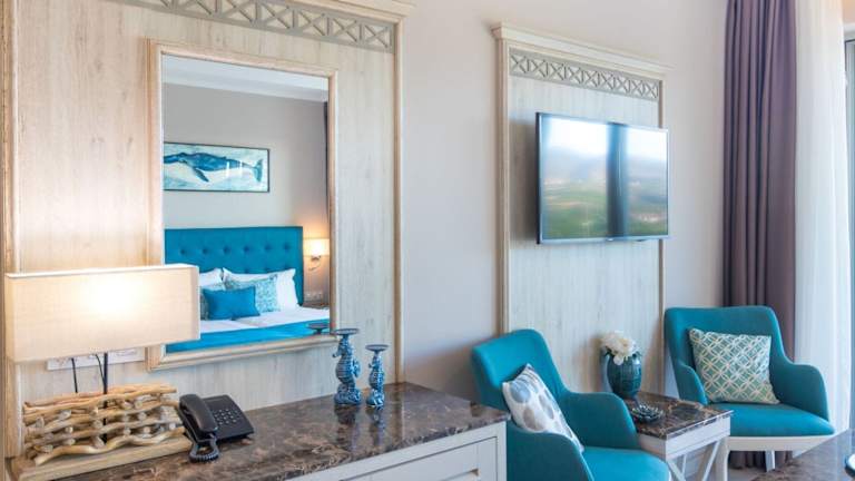 Die klimatisierten Zimmer sind mit einem Balkon oder einer Terrasse ausgestattet, die meist einen Blick auf das Meer bieten. Zur Ausstattung zählen Doppelbett, Sofabett, Minibar, Schreibtisch, Kühlschrank, Tee-/Kaffeemaschine und TV-Gerät. Die Badezimmer verfügen über Dusche und Badewanne, Haartrockner sowie Kosmetikartikel. Die Unterkunft bietet Familienzimmer und rollstuhlgerechte Optionen.