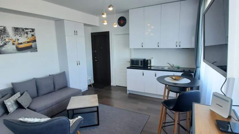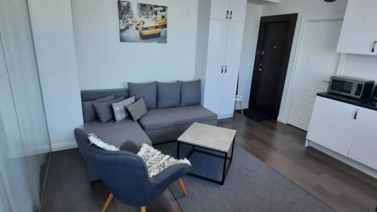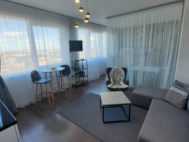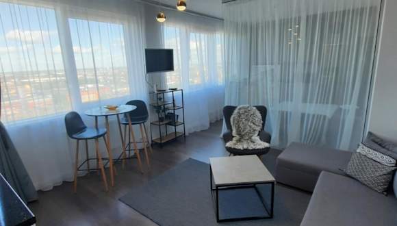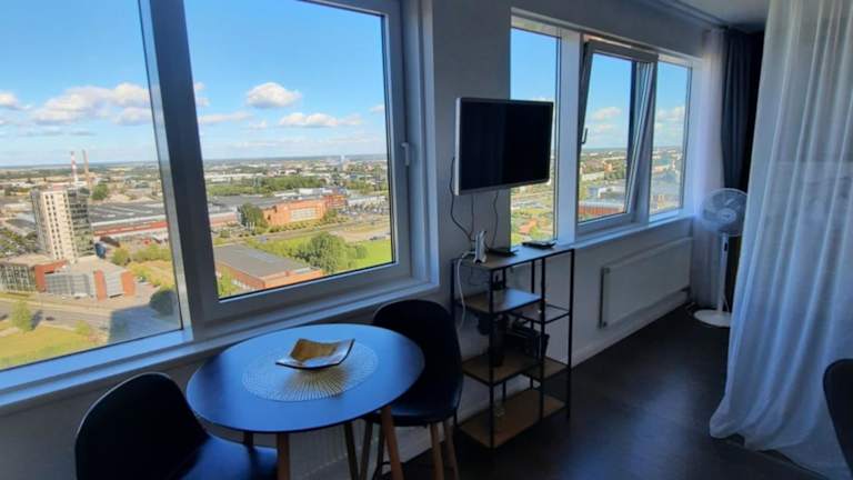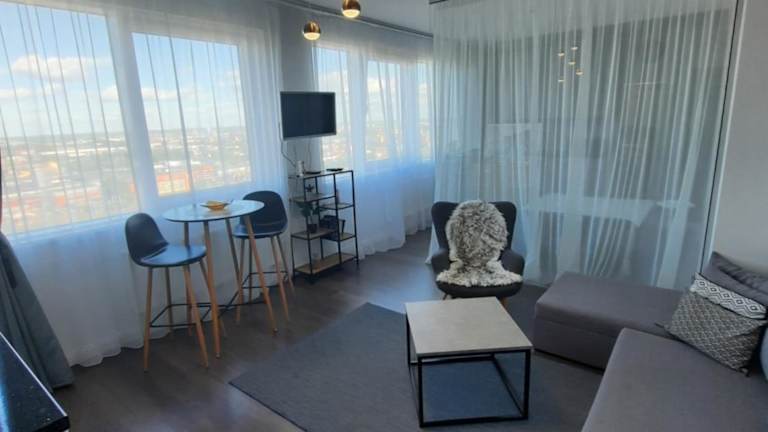 Die Ferienwohnung Klaipėda city panoramic view bietet helle und einladende Übernachtungsmöglichkeiten mit einem eigenen Strandbereich und kostenlosem Wifi.