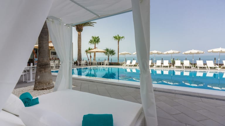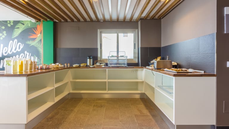 Poolbar mit Buffetecke für das Frühstück und tagsüber Getränke, Tapas und Snacks.