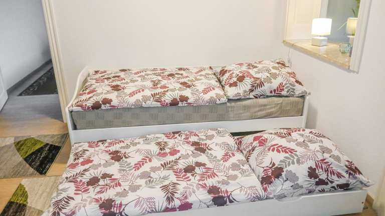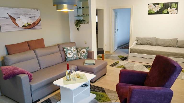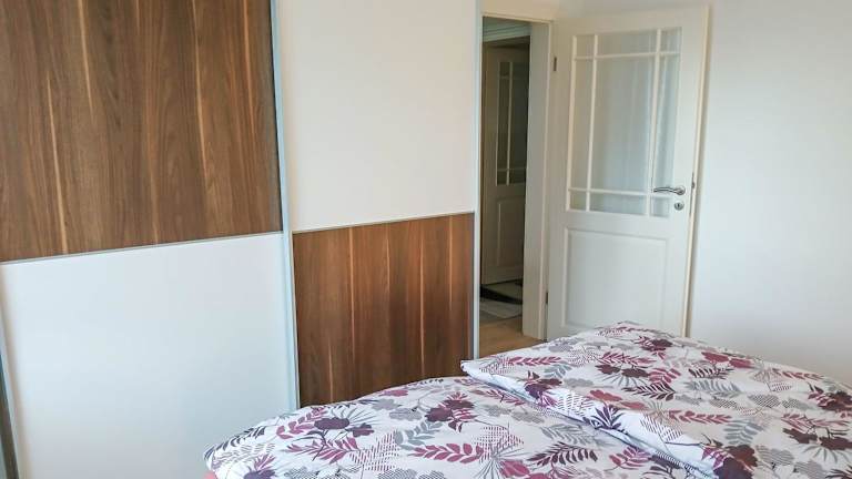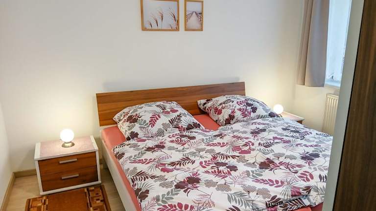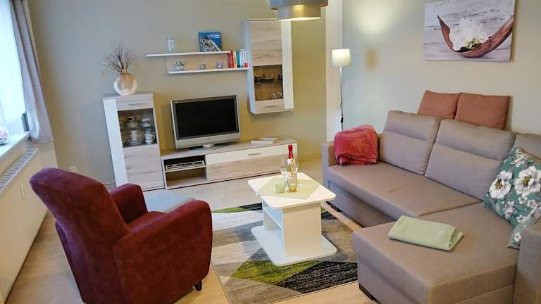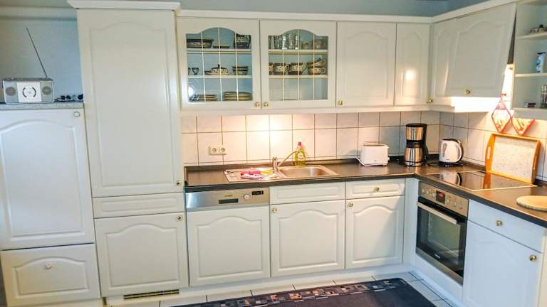 Das Ferienhaus bietet ein Schlafzimmer und ein Wohnzimmer mit einem Flachbild-TV. Die Küche ist gut ausgestattet mit Kühlschrank und Geschirrspüler. Handtücher und Bettwäsche werden bereitgestellt.