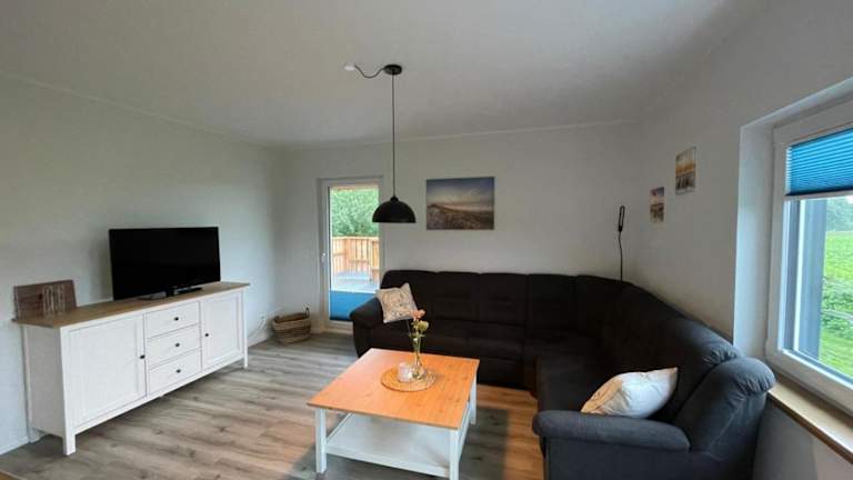 Die Ferienwohnung umfasst 3 Schlafzimmer, ein Wohnzimmer mit Flachbild-TV, eine gut ausgestattete Küche mit Kühlschrank und Geschirrspüler sowie ein Badezimmer mit Dusche. Handtücher und Bettwäsche werden zur Verfügung gestellt. Eine Terrasse mit Gartenblick ergänzt das Angebot.