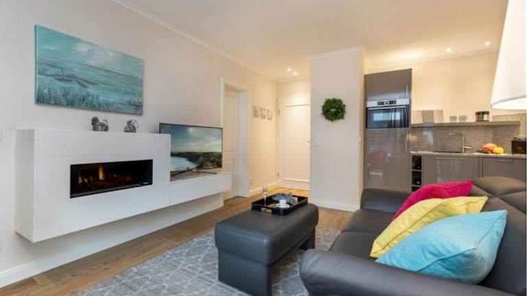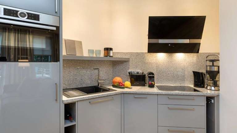 Die Ferienwohnung besteht aus einem Schlafzimmer, einem Wohnzimmer und einer voll ausgestatteten Küchenzeile, die mit einem Kühlschrank und einer Kaffeemaschine ausgestattet ist. Das Badezimmer ist mit einer Dusche und einem Haartrockner versehen. Zudem steht ein Flachbild-TV zur Verfügung.