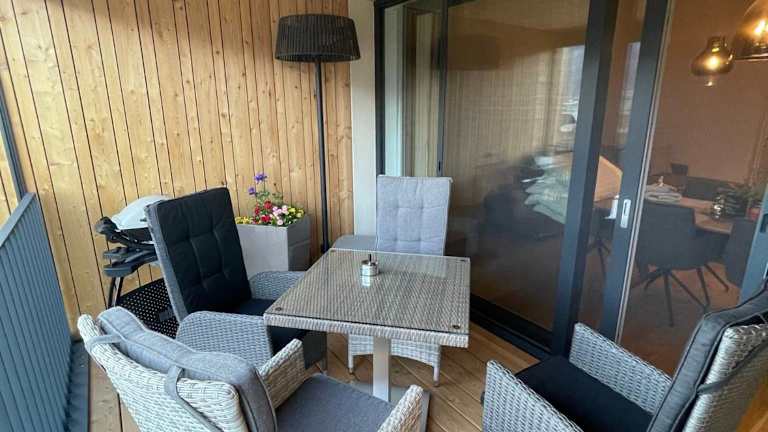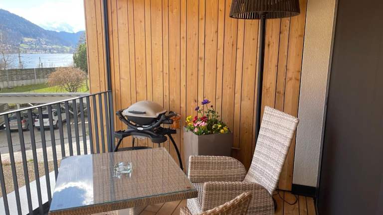 Die Ferienwohnung ist ausgestattet mit einem Schlafzimmer, einer Küche, die einen Kühlschrank und einen Geschirrspüler umfasst, sowie einem Flachbild-TV. Ein Sitzbereich und ein Badezimmer mit Dusche sind ebenfalls vorhanden. Handtücher und Bettwäsche werden bereitgestellt. Zusätzlich bietet die Unterkunft einen Balkon mit Blick auf den See.