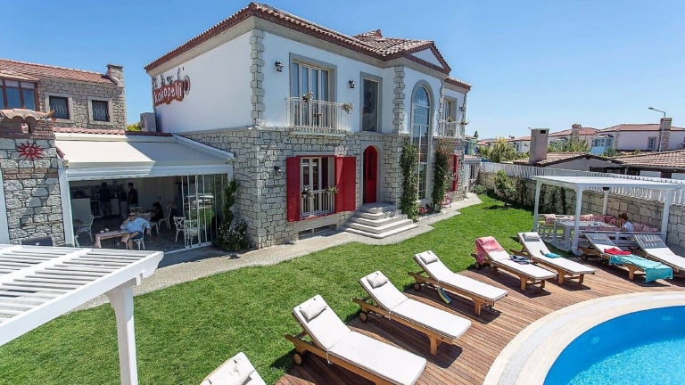 Das Kokopelli Alacati ist ein charmantes Bed & Breakfast, das Ihnen eine angenehme Unterkunft in der Nähe der antiken Stadt Erythrai bietet. Genießen Sie den saisonalen Außenpool, das Restaurant und den Garten sowie den kostenlosen WLAN-Zugang in allen Bereichen der Unterkunft. Die klimatisierten Zimmer verfügen über eine Terrasse, einen Flachbild-TV und ein eigenes Bad. Beginnen Sie Ihren Tag mit einem köstlichen kontinentalen oder Halal-Frühstück und entspannen Sie auf der Sonnenterrasse. Besuchen Sie auch die nahe gelegene Burg von Cesme und den Yachthafen von Cesme. Der Flughafen Chios ist ebenfalls leicht erreichbar.