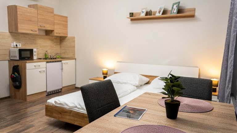 Jede Wohneinheit ist mit einer Terrasse und Stadtblick ausgestattet. Die Zimmer bieten einen Satelliten Flachbild-TV, eine gut ausgestattete Küchenzeile mit Kühlschrank, Mikrowelle und Herdplatte, sowie ein eigenes Badezimmer mit Dusche, Haartrockner und Hausschuhen. Des Weiteren sind die Zimmer schallisoliert und mit Klimaanlage sowie Heizung ausgestattet.