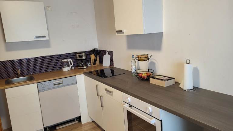 Die Ferienwohnung umfasst ein helles Schlafzimmer und eine gut ausgestattete Küche mit Kühlschrank und Geschirrspüler. Ein Flachbild-TV und ein gemütlicher Sitzbereich stehen den Gästen zur Verfügung. Zudem ist ein modernes Badezimmer mit Dusche vorhanden. Handtücher und Bettwäsche werden bereitgestellt.