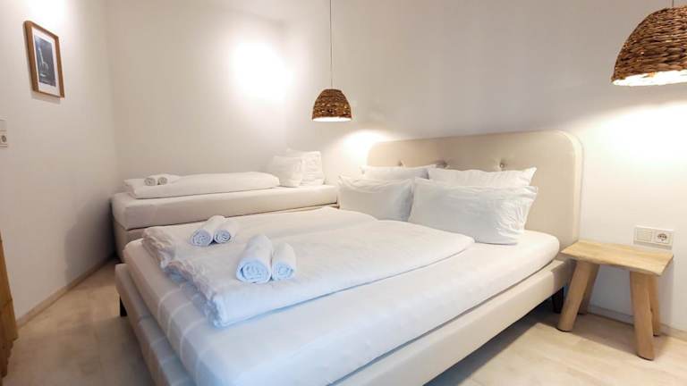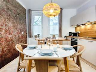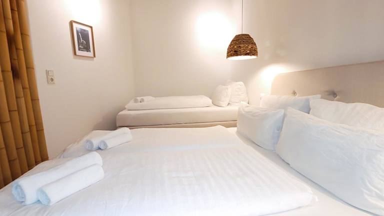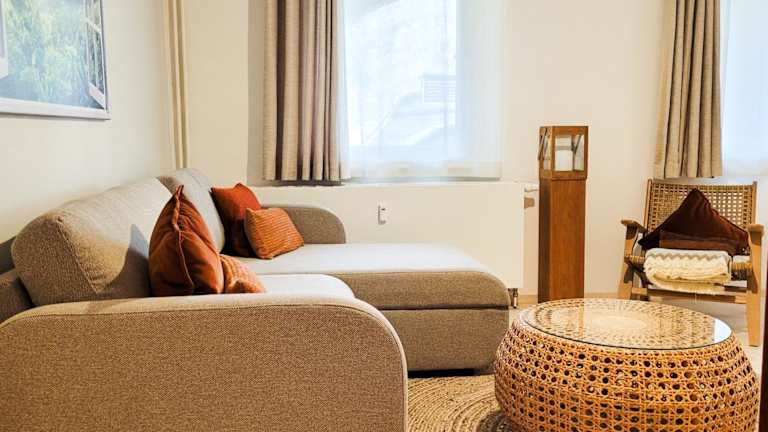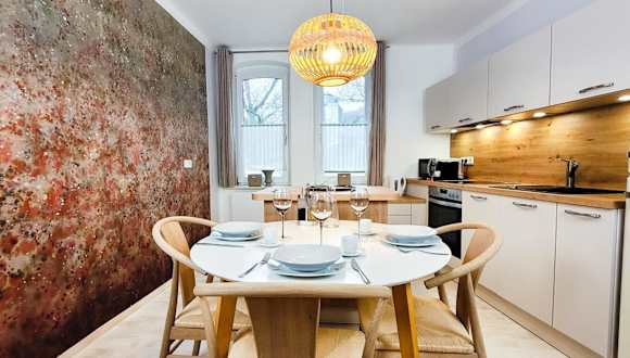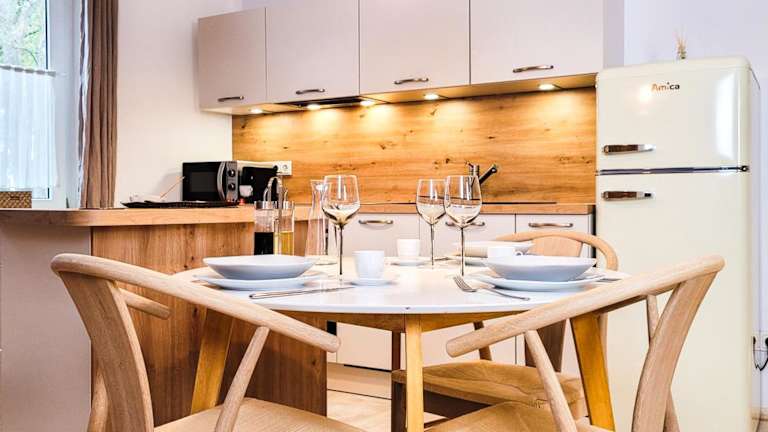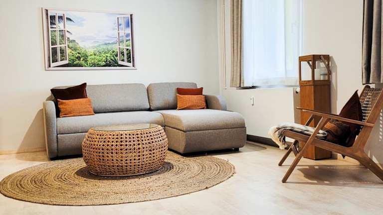 Die Ferienwohnung besteht aus 1 Schlafzimmer, einem Wohnzimmer und einer voll ausgestatteten Küche mit Kühlschrank und Kaffeemaschine. Ein Badezimmer mit Dusche und Haartrockner sowie die Bereitstellung von Handtüchern und Bettwäsche runden die Ausstattung ab. Schallisolierte Zimmer sorgen für Ruhe während des Aufenthalts.