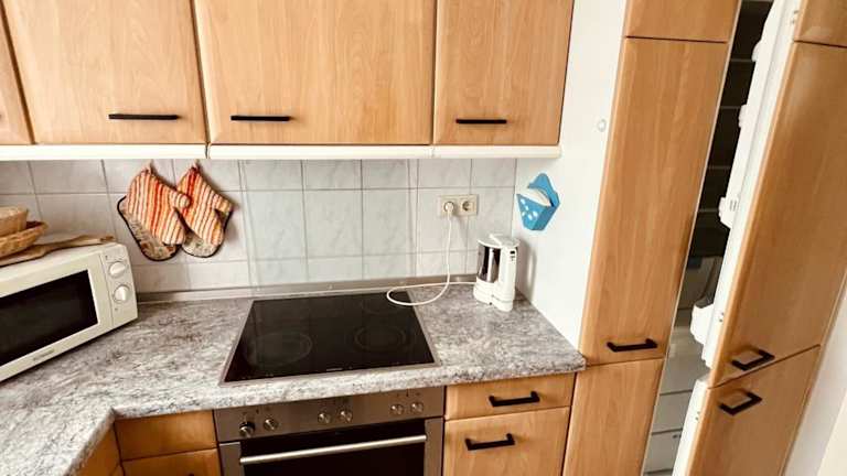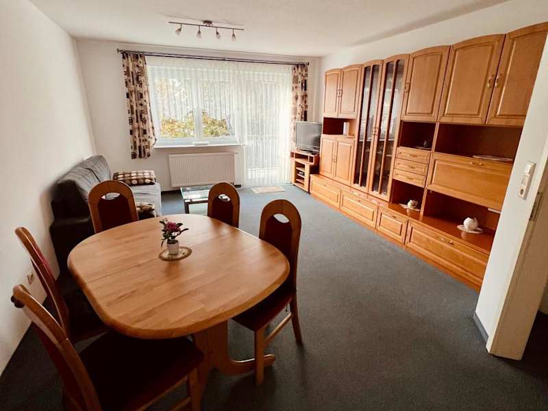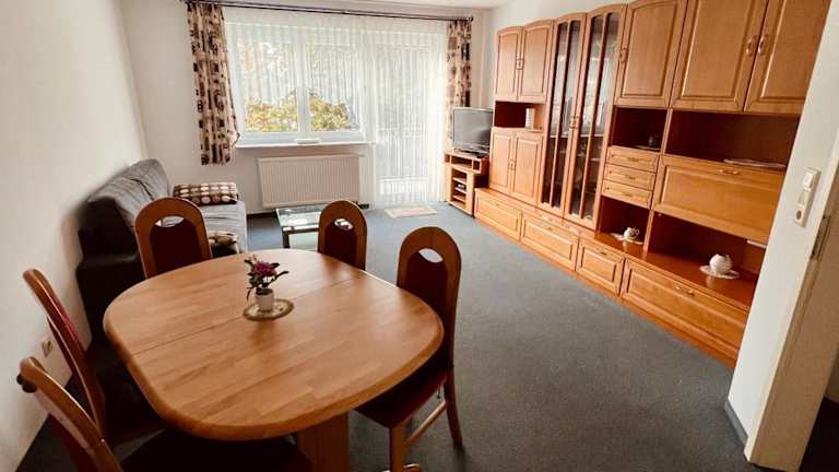 Die Ferienwohnung umfasst 1 Schlafzimmer, ein helles Wohnzimmer mit Flachbild-TV, eine gut ausgestattete Küche mit Kühlschrank und Geschirrspüler sowie ein Badezimmer. Die Ausstattung verspricht ein gemütliches Ambiente und nötige Bequemlichkeiten für einen angenehmen Aufenthalt.