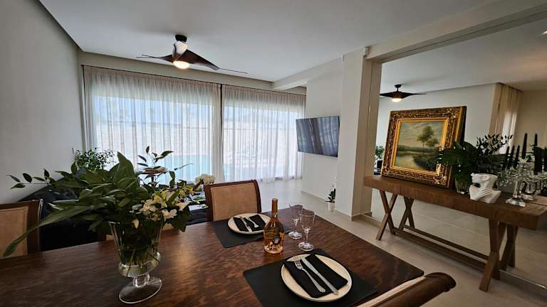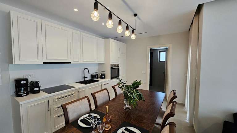 Die Ferienwohnung ist klimatisiert und besteht aus zwei Schlafzimmern, einem Wohnzimmer und einer voll ausgestatteten Küche mit Kühlschrank und Kaffeemaschine. Es gibt drei Badezimmer mit Dusche und kostenlosen Pflegeprodukten. Handtücher und Bettwäsche können gegen Aufpreis bereitgestellt werden.