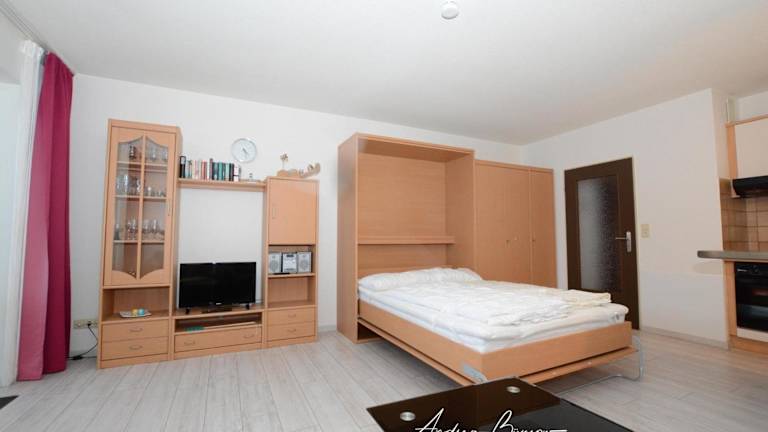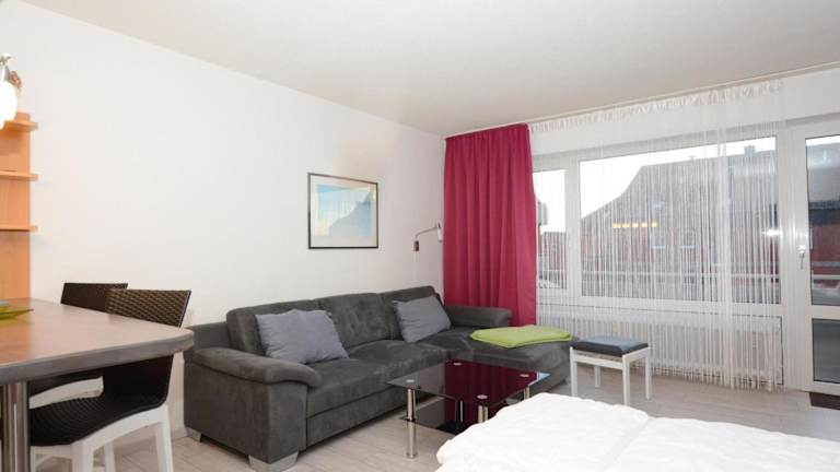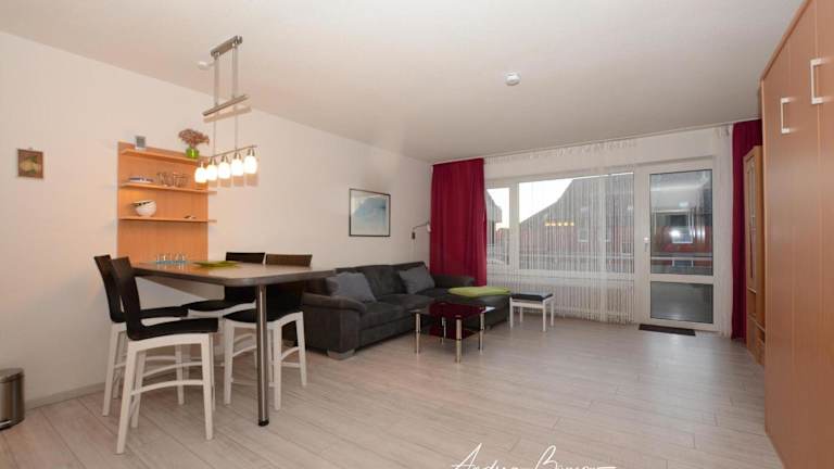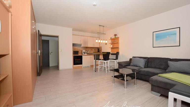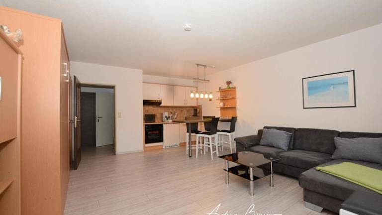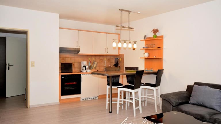 Die Ferienwohnung ist mit einem Wohnzimmer und einer voll ausgestatteten Küche, inklusive Kühlschrank und Ofen, eingerichtet. Handtücher und Bettwäsche werden bereitgestellt.