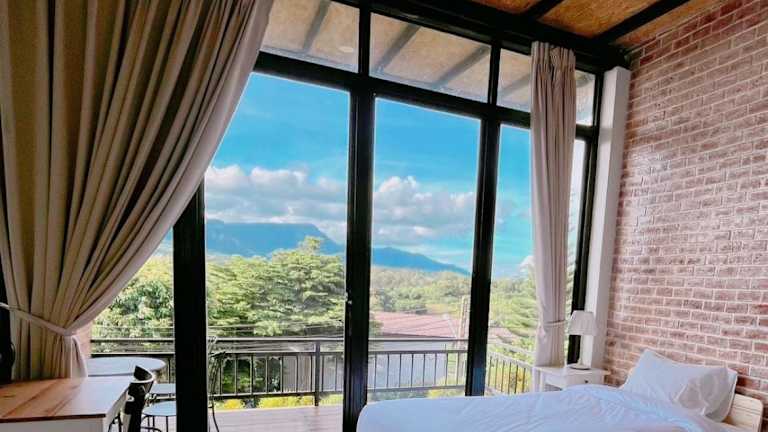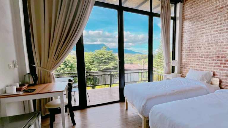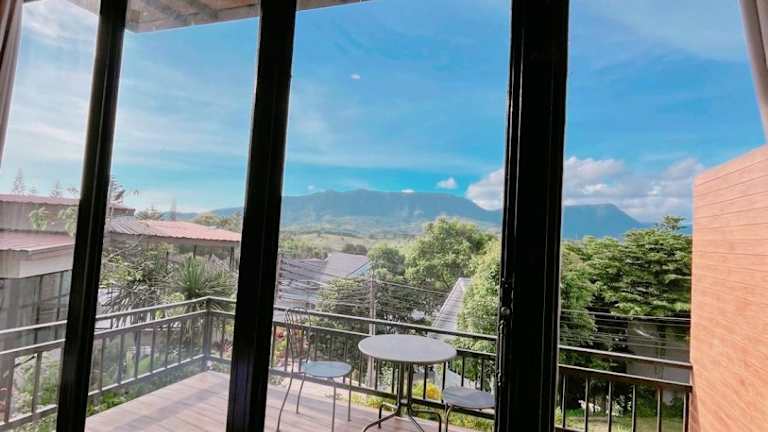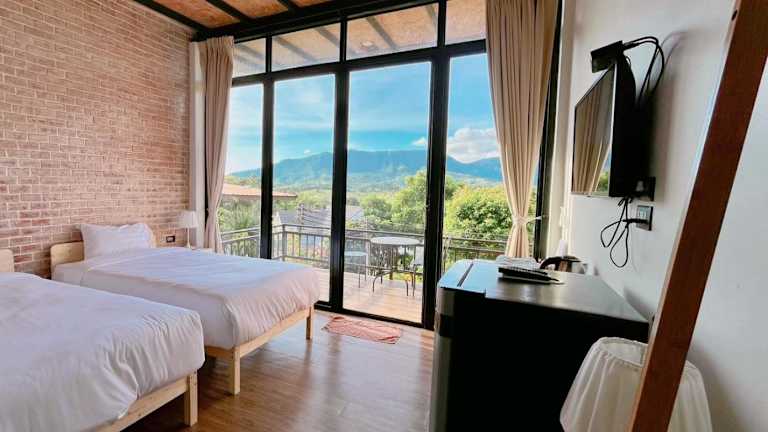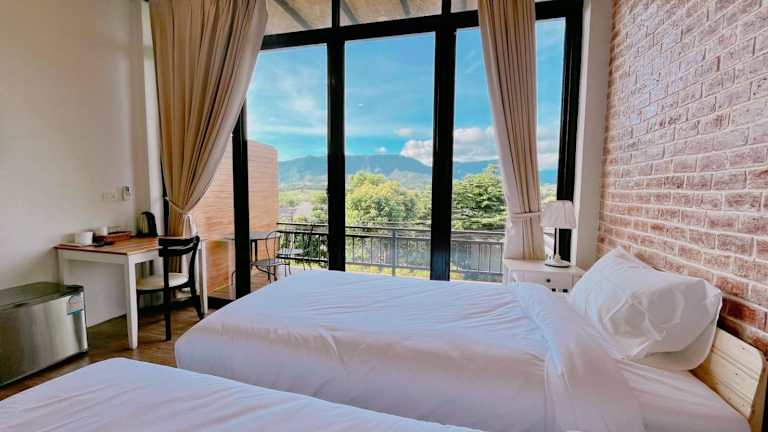 Einige Zimmer im Krin Resort verfügen über einen Balkon mit Blick auf die Berge. Die Zimmer bieten eine angenehme Bequemlichkeit für einen erholsamen Aufenthalt.