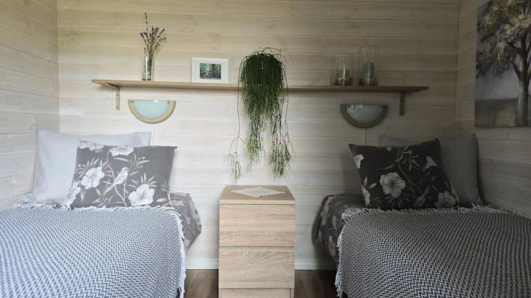 Das Ferienhaus umfasst zwei Schlafzimmer und ein Badezimmer. Zur Ausstattung gehören Bettwäsche, Handtücher, ein Flachbild-TV sowie eine voll ausgestattete Küchenzeile. Die Terrasse bietet einen schönen Blick auf den Garten.