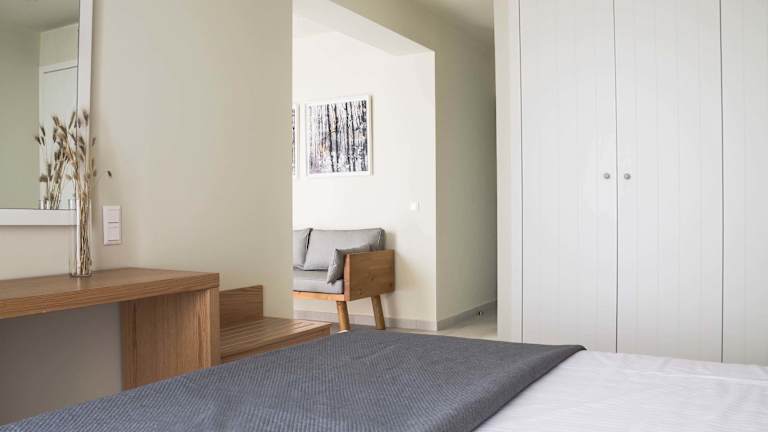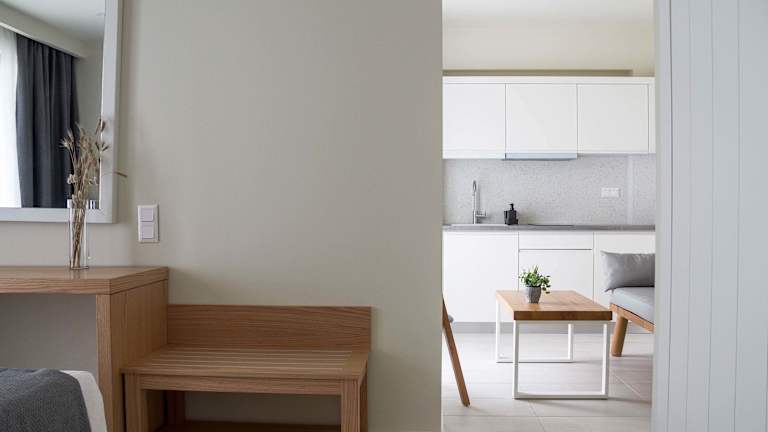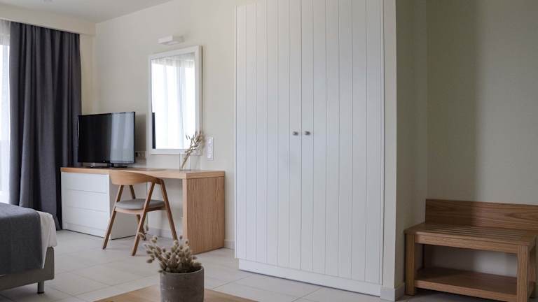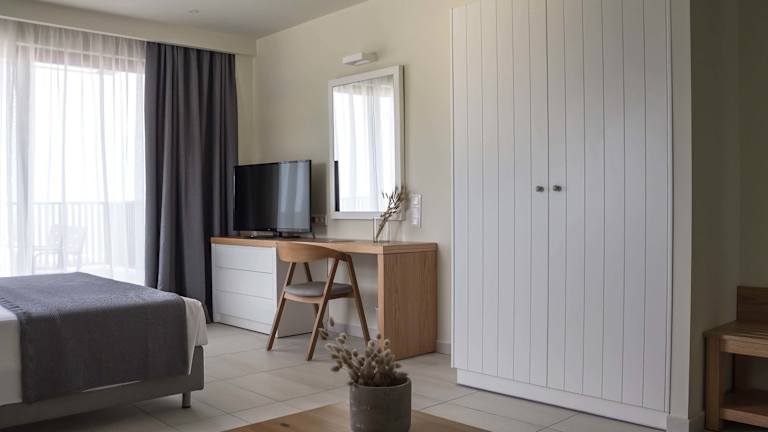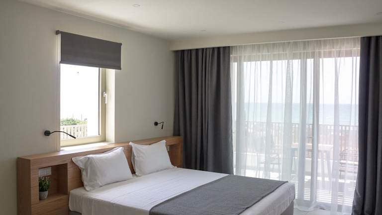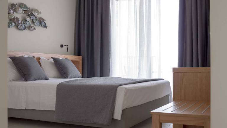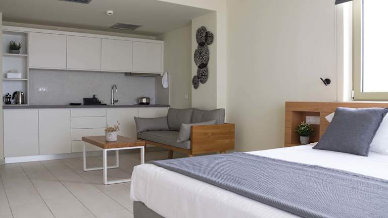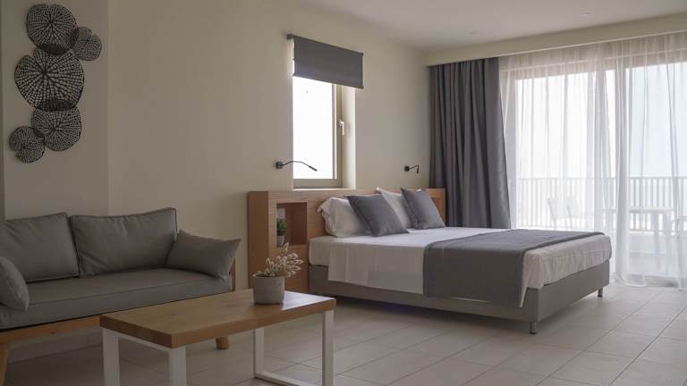 Die Zimmer verfügen über ein Queensize-Bett, eine Klimaanlage, Heizung, einen Flachbild-TV sowie einen Kühlschrank und eine Kochnische mit Tee-/Kaffeemaschine. Zudem gibt es ein eigenes Badezimmer mit Dusche und Haartrockner. Die Gäste können den herrlichen Meerblick von einem Balkon oder einer Terrasse geniessen. Alle Zimmer sind Nichtraucherzimmer.