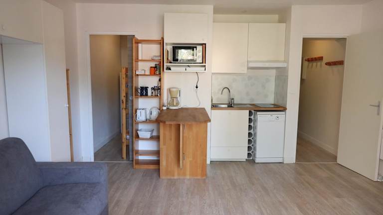 Die Ferienwohnung besteht aus einem Schlafzimmer, einem Wohnzimmer und einer voll ausgestatteten Küchenzeile, in der sich ein Kühlschrank und eine Kaffeemaschine befinden. Das Badezimmer ist mit einer Badewanne oder Dusche und einem Haartrockner ausgestattet. Zudem gibt es einen Flachbild-TV. Bettwäsche und Handtücher sind gegen einen Aufpreis erhältlich.