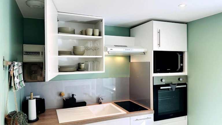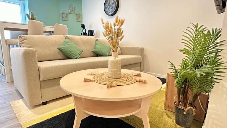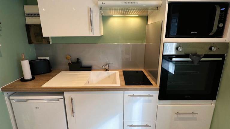 Die Ferienwohnung verfügt über 1 Schlafzimmer und ein Wohnzimmer. Sie beinhaltet eine voll ausgestattete Küche mit Kühlschrank und Kaffeemaschine sowie ein Badezimmer mit Dusche und Haartrockner. Handtücher und Bettwäsche werden bereitgestellt.