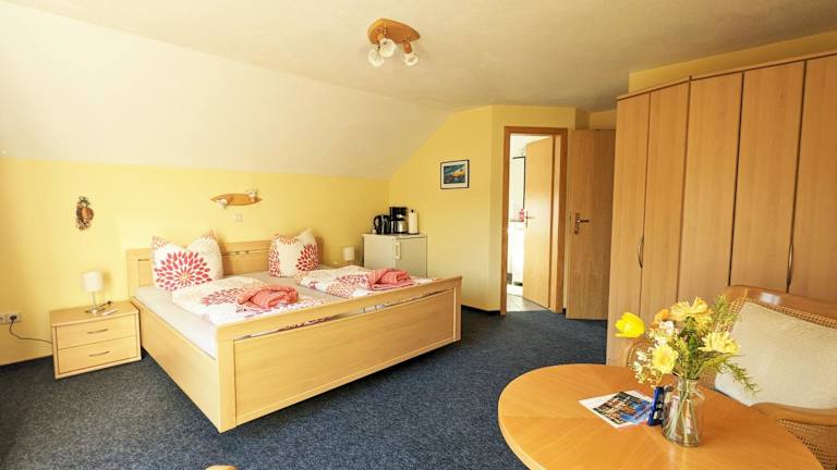 Die Ferienwohnung umfasst ein Schlafzimmer und ein Badezimmer, das mit einem Haartrockner ausgestattet ist.