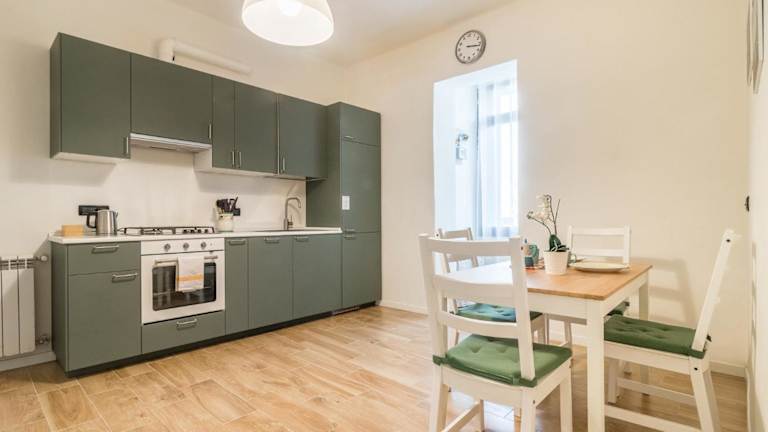 Die gut ausgestattete Küchenzeile der Ferienwohnung beinhaltet einen Kühlschrank, einen Geschirrspüler und einen Ofen. Zudem steht ein Haartrockner zur Verfügung.