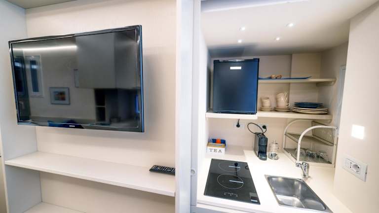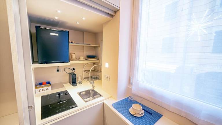 Die Küchenzeile ist ausgestattet mit einem Kühlschrank, einer Mikrowelle, einer Herdplatte, einer Kaffeemaschine und einem Wasserkocher.
