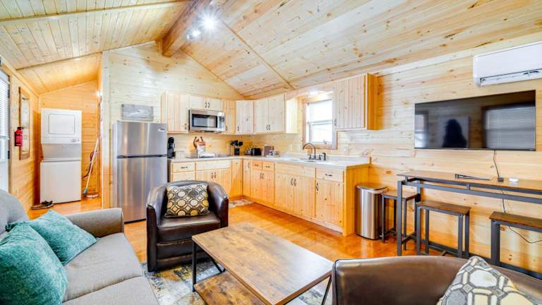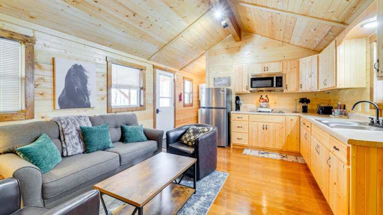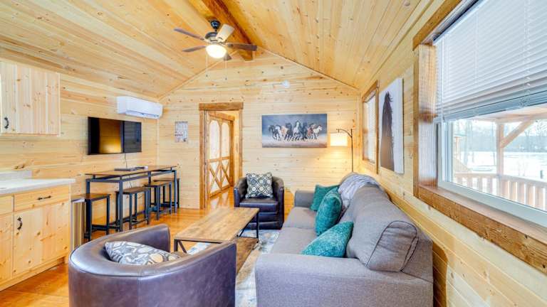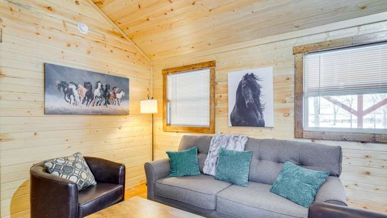 La Grange Cabin befindet sich auf einer Rennpferdefarm und bietet eine malerische Aussicht auf den Teich. Die Unterkunft ermöglicht einen angenehmen Aufenthalt mit verschiedenen Annehmlichkeiten, darunter kostenfreies WLAN in der gesamten Unterkunft und Klimaanlage.