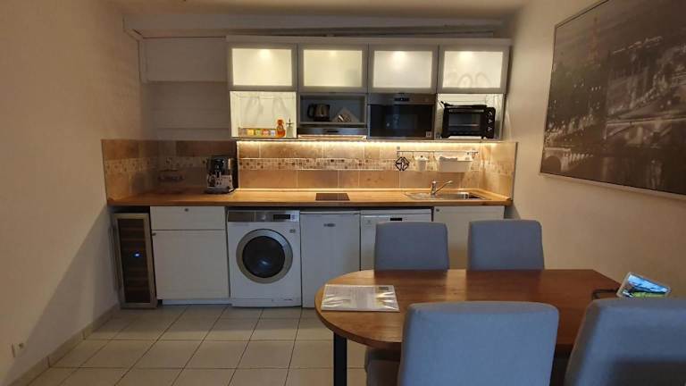 Das Apartment verfügt über einen Flachbild-TV und ein eigenes Bad mit Dusche und Haartrockner. Die voll ausgestattete Küche bietet Ihnen ein Kochfeld, einen Geschirrspüler, eine Mikrowelle sowie eine Nespresso-Kaffeemaschine. Zu den Annehmlichkeiten gehören Bettwäsche, Handtücher, Pflegeprodukte sowie ein ätherischer Öldiffusor. Auch eine Waschmaschine/Trockner und ein Staubsauger sind vorhanden. Zudem ist eine Tasche mit Spielzeug für Kinder bereitgestellt.