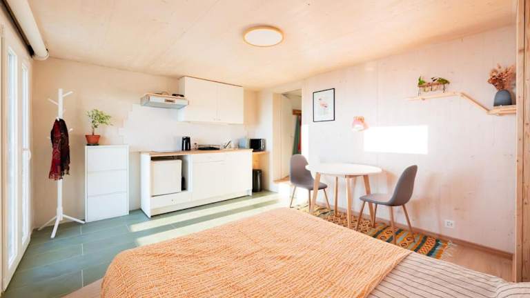 Die Ferienwohnung bietet folgendes: ein Schlafzimmer, eine Küchenzeile mit Kühlschrank, Mikrowelle und Kaffeemaschine. Handtücher und Bettwäsche sind ebenfalls vorhanden.