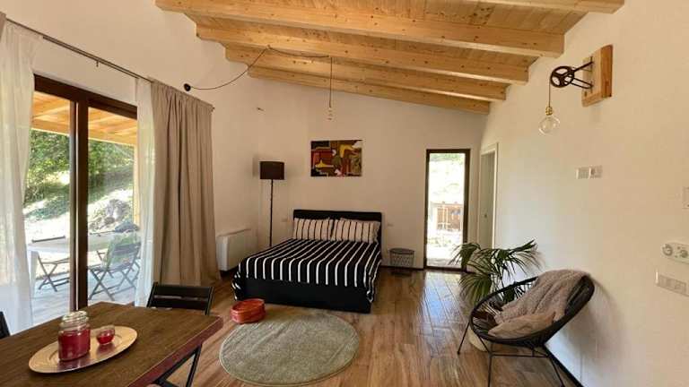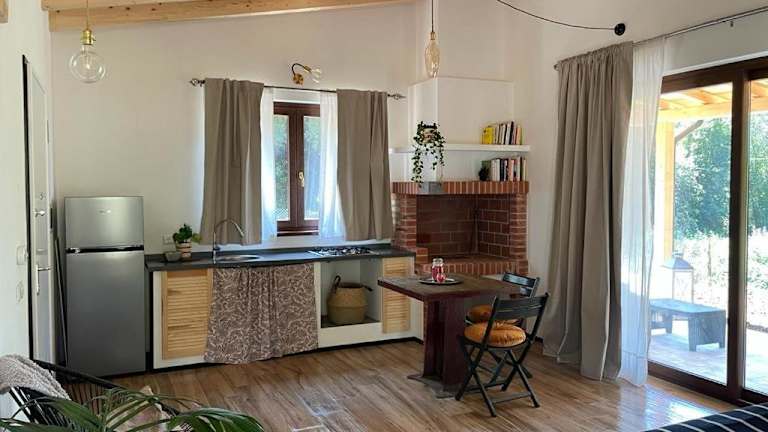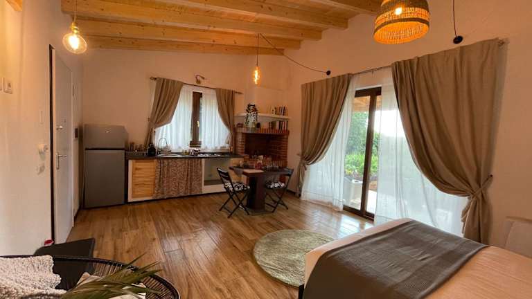 Dieses Ferienhaus hat ein Schlafzimmer und ein Wohnzimmer, das mit Klimaanlage ausgestattet ist. Es verfügt über eine voll ausgestattete Küche mit Kühlschrank und Kaffeemaschine sowie ein Badezimmer mit Badewanne oder Dusche und Haartrockner.