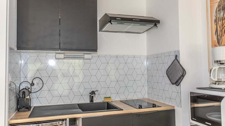 Die Ferienwohnung verfügt über eine gut ausgestattete Küche mit Kühlschrank, Ofen, Mikrowelle, Kaffeemaschine und Wasserkocher, was Gästen die Möglichkeit bietet, ihre eigenen Mahlzeiten zuzubereiten. Für eine kleine Zwischenmahlzeit oder einen Snack stehen verschiedene Optionen zur Verfügung.