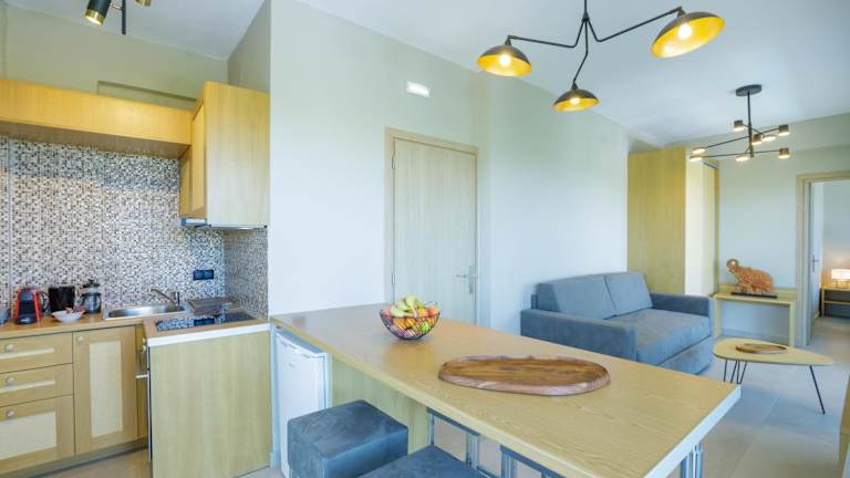 Die Ferienwohnung ist klimatisiert und besteht aus einem Schlafzimmer, einem Wohnzimmer und einer voll ausgestatteten Küche mit Kühlschrank und Kaffeemaschine. Zur Ausstattung gehört ein Badezimmer mit Dusche und Whirlpool. Handtücher und Bettwäsche werden zur Verfügung gestellt. Die Zimmer sind schallisoliert.