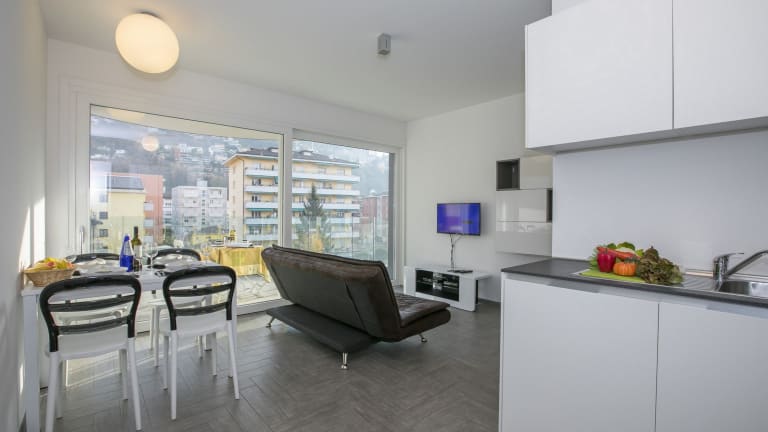Machen Sie das Meiste aus Ihrem City Break in dieser schicken, sorglosen Ausgangsbasis. Die geräumige Stadtwohnung mit 2 Schlafzimmern ist das ganze Jahr hindurch eine fantastische Wahl für Gruppen mit bis zu 4 Personen, die eine zugängliche, kinderfreundliche Ferienwohnung im Zentrum von Lugano suchen. Das Apartment befindet sich in der Nähe des Luganer Zentrums und alle Annehmlichkeiten, Attraktionen und Verkehrsanbindungen der Stadt befinden sich nur einen Katzensprung entfernt. Ideal für Familien mit Kinderwagen oder für Gehbehinderte. Das moderne Apartment liegt im 3. Stock der Residenz und lässt sich praktisch mit einem Aufzug erreichen. Im Inneren finden Sie viel Platz, eine warme Fußbodenheizung und sonnige Privatbalkone vor, sodass Sie sich ganz wie zu Hause fühlen können. Die große, gut beleuchtete Küche mit Essbereich ist als offenes Layout konzipiert. Die Wohnung hat ein Hauptschlafzimmer mit Doppelbett und ein zweites Schlafzimmer mit zwei Einzelbetten, ideal für flexible Gruppen und Familien. Abgerundet wird dieses entzückende Apartment durch ein modernes Badezimmer mit Dusche. Während Ihres Aufenthalts können Sie natürlich auch die Parkplätze, den Kinderspielplatz und das Fitnesszentrum auf dem Gemeinschaftsgrundstück nutzen. Die Lage der Residenz ist zentral und die Highlights der Stadt Lugano liegen direkt vor Ihrer Haustür. Die Schweizer Stadt Lugano ist das ganze Jahr hindurch ein perfektes Urlaubsziel. Hier finden Sie Restaurants mit verschiedenen Küchen, Designergeschäfte, kulturelle Museen, Kunstgalerien, Freizeitmöglichkeiten, ein aufregendes Nachtleben und viele Attraktionen für jeden Geschmack. Die Flughäfen Lugano und Malpensa sind schnell zu erreichen. In der Nähe befinden sich landschaftlich bezaubernde Wanderstrecken, Skiorte und die Sehenswürdigkeiten am Luganer See, Ticino und am Comer See. Ihnen steht ein unvergesslicher Urlaub bevor! Entspannung Offener Wohnbereich • Ein geräumiger, einladender Raum, perfekt um zu entspannen oder kostbare Momente mit Ihren Lieben zu verbringen • Mit Sitzbereich und einer vollständig ausgestatteten Küche mit Essbereich • Mit Flachbild-TV und DVD-Spieler und Zugang zu einem Privatbalkon Kochen und Essen Küche mit Essbereich • Die moderne Küche bietet alles, was Sie für Ihren Selbstversorgerurlaub benötigen • Die Küche ist vollständig mit Ofen, Induktionsherdplatten, Mikrowelle, Toaster, elektrischem Wasserkessel, Kühl- und Gefrierschrank und Geschirrspülmaschine ausgestattet • Kochutensilien, Geschirr und Besteck sind vorhanden • Abgerundet mit einer stylishen Essecke mit Platz für bis zu 4 Personen Schlafen Das flexible Apartment ist großzügig ausgelegt und perfekt für Familien und Gruppen mit bis zu 4 Personen Hauptschlafzimmer • Großes Schlafzimmer für ein Pärchen mit Doppelbett • Mit praktischem Einbauschrank und Zugang zum Balkon Schlafzimmer 2 • Ein flexibles Schlafzimmer mit Einzelbetten, ideal für Kinder • Möbliert mit 2 Einzelbetten und einem Schrank • Mit Balkonzugang Extras Auf Wunsch können für einen kleinen Aufpreis ein Klappbett für Erwachsene oder Babybettchen gestellt werden Badezimmer Ein zeitgemäßes, gefliestes Badezimmer • Ein neu eingebautes Badezimmer mit Duschkabine, Waschbecken, WC und Bidet Zusätzliche Annehmlichkeiten Eine Waschmaschine und ein Bügeleisen sind ebenfalls vorhanden Für eine zusätzliche Wochengebühr kann auf Anfrage ein WLAN-Modem gestellt werden (bitte bei der Buchung mitbestellen). Das Apartment befindet sich im 3. Stock der Residenz und ist praktisch mit dem Aufzug erreichbar. Zur Residenz gehört auch ein Fitnesszentrum, das allen Gästen zur Verfügung steht. Falls Sie mit größeren Gruppen verreisen, besteht die Möglichkeit, gemeinsam mit diesem Apartment auch weitere Apartments in der Perla del Ticino Residenz anzumieten. Es stehen noch ein ähnliches Studio und Apartments mit 1 Schlafzimmer und mit 2 Schlafzimmer zur Verfügung. Bitte anfragen. Außenbereich Dieses geräumige Familienapartment hat mehrere sonnige Privatbalkone, auf denen Sie sich entspannen und abends mit Ihren Lieben zusammen sitzen können. Die Kulisse ist einmalig, Sie haben einen Blick über die Stadt, bis hin zu den Bergen. Dieser Ausblick begeistert das ganze Jahr hindurch. Zur Residenz gehört auch ein Kinderspielplatz im Freien, perfekt für die jüngeren Gäste. Parkmöglichkeiten Die Residenz verfügt über eine Garage.. Ort Die Lage dieser Ferienwohnung ist einmalig. Die Sehenswürdigkeiten und Attraktionen in und um Lugano sind fix zu erreichen. Das moderne Zentrum am See bietet Boulevards mit Designerläden, Museen, Kunstgalerien, Kasinos und Nachtklubs sowie Antikläden, traditionelle Märkte und zeitlose Urlaubsaktivitäten. Zu den beliebten Attraktionen gehören der Parco Civico, das Museo Civico di Belle Arti, das Museo Cantonale d´Arte, das Museo Cantonale di Storia Naturale, das familienfreundliche Lido di Lugano, der Tennisplatz und die Cattedrale di San Lorenzo. Die charmanten, mit Cafés umsäumten Piazzen der Stadt, die idyllische Seepromenade, die Panoramablicke und die Bootsausflüge verleihen Ihrem Urlaub ein romantisch-italienisches Flair für einen unvergesslichen Aufenthalt in der relaxten aber dynamischen Schweizer Seestadt. Die Verkehrsanbindungen in Lugano sind fantastisch: Fähre, Straßenanbindungen, Zugverbindungen und schnelle Erreichbarkeit des Flughafens. Das Apartment befindet sich nur 8 Autominuten vom Luganer Flughafen entfernt. Während Ihres Aufenthalts in Lugano können Sie mit dem Auto auch schnell den Golfplatz, den ikonischen Monte Bré, den ambienten Olive Trail und die vielen Attraktivitäten von Ticino und vom bezaubernden zentralen Comer See erreichen.