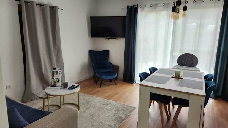 Die Ferienwohnung umfasst 1 Schlafzimmer, ein Wohnzimmer mit Flachbild-TV, eine gut ausgestattete Küche mit Kühlschrank und Geschirrspüler sowie 1 Badezimmer mit Dusche. Handtücher und Bettwäsche werden bereitgestellt.