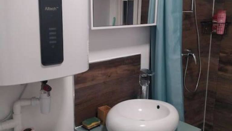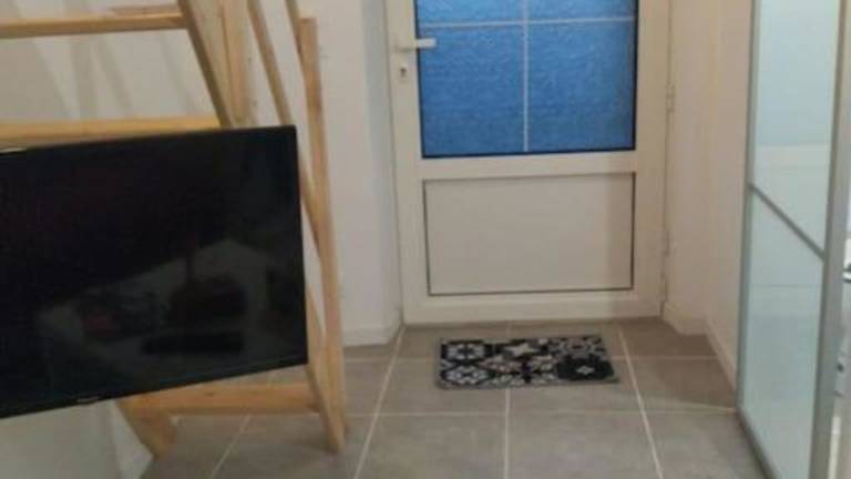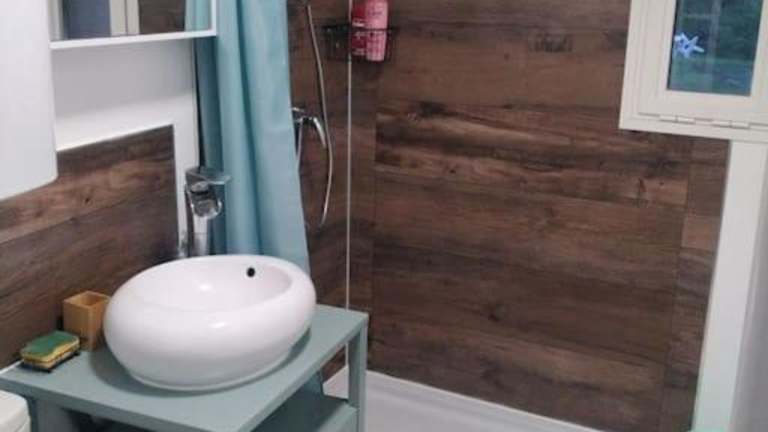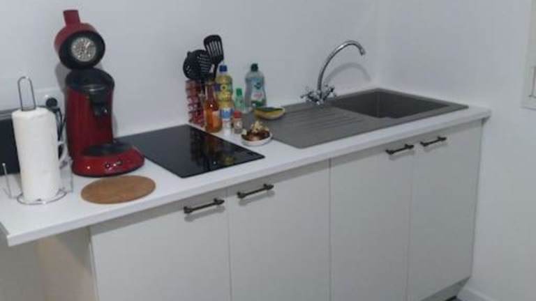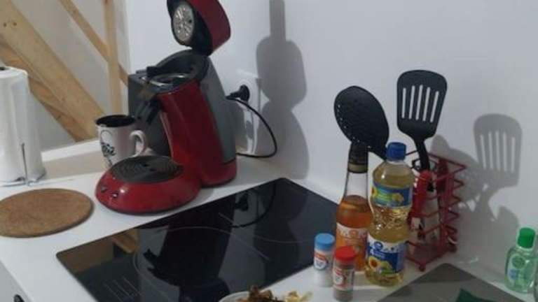 Das Ferienhaus verfügt über ein Schlafzimmer sowie eine Küche, die mit einem Ofen und einer Mikrowelle ausgestattet ist.