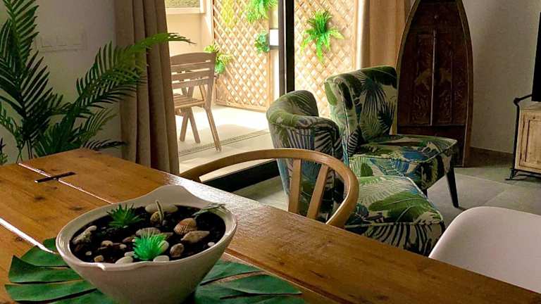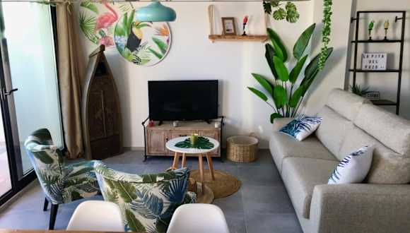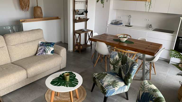 Die einfach und komfortabel eingerichtete Ferienwohnung umfasst zwei Schlafzimmer, ein Wohnzimmer sowie eine voll ausgestattete Küche mit Kühlschrank und Kaffeemaschine. Zudem sind zwei Badezimmer mit Dusche vorhanden. Handtücher und Bettwäsche werden zur Verfügung gestellt, und die gesamte Unterkunft ist klimatisiert.