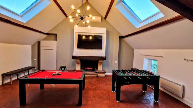 Die Villa bietet verschiedene Freizeitmöglichkeiten, darunter einen beheizten Innenpool, eine Sauna sowie Unterhaltungsmöglichkeiten wie Billard und Babyfoot. Ein Garten lädt zur Erholung ein.