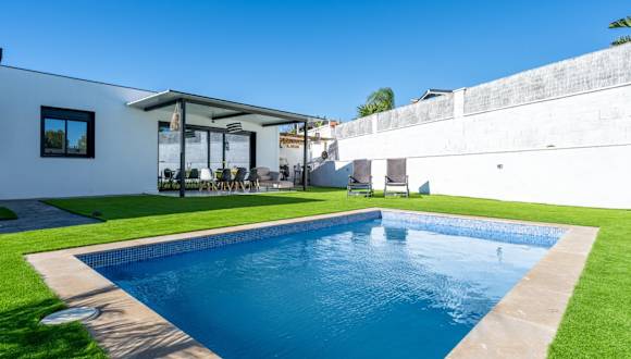 Die Villa verfügt über Klimaanlage, 3 separate Schlafzimmer, eine voll ausgestattete Küche mit Kühlschrank und Geschirrspüler sowie 2 Badezimmer. Handtücher und Bettwäsche werden bereitgestellt.