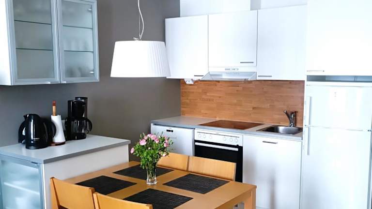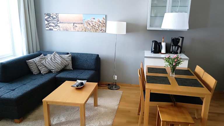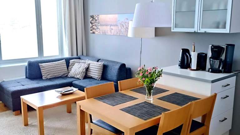 Die Ferienwohnung verfügt über 2 Schlafzimmer, ein Wohnzimmer und eine voll ausgestattete Küche, die mit einem Kühlschrank und einer Kaffeemaschine ausgestattet ist. Es gibt 2 Badezimmer mit Dusche und Haartrockner. In der Unterkunft werden Handtücher und Bettwäsche bereitgestellt. Die Ferienwohnung ist klimatisiert und schallisoliert.