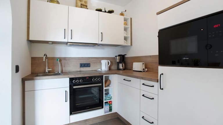 In der Küche der Ferienwohnung sind Kühlschrank, Geschirrspüler und Ofen vorhanden, was die Zubereitung von eigenen Mahlzeiten ermöglicht. Es sind keine Informationen über Verpflegungsmöglichkeiten in Form von gastronomischen Angeboten vor Ort gegeben.