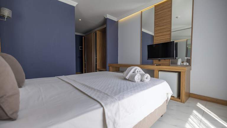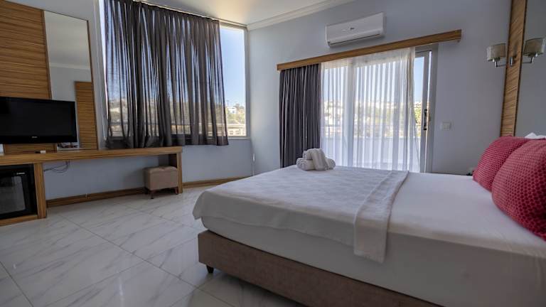 Die Zimmer sind mit Klimaanlage und individuell regulierbarer Heizung ausgestattet. Jedes Zimmer verfügt über einen Balkon oder eine Terrasse mit Meerblick, ein Doppelbett sowie die Möglichkeit, Kinderbetten aufzustellen. Zur Ausstattung gehören auch ein Safe, eine Minibar und eine Kochnische. Die Badezimmer sind mit Dusche und Badewanne ausgestattet und bieten einen Haartrockner. Es sind auch barrierefreie Zimmer verfügbar.