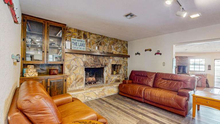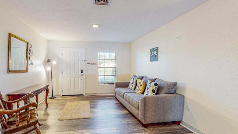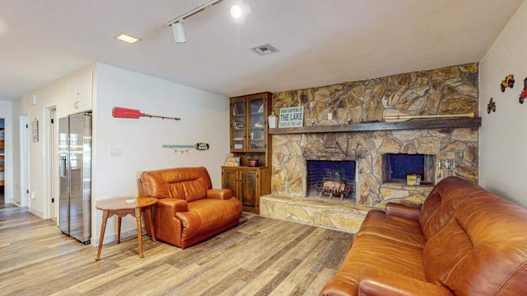 Lakefront Living ist ein heimeliges Ferienhaus mit einer Veranda und Blick auf den See. Die Unterkunft bietet ein einladendes Ambiente für einen erholsamen Aufenthalt in der Natur.