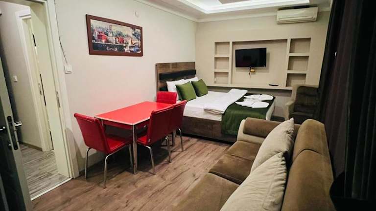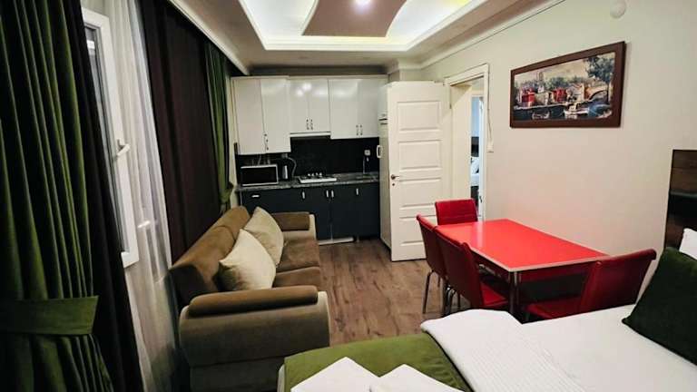ie klimatisierten Apartments im LALE SULTAN SÜİT APART bieten eine komfortable Unterkunft mit kostenfreiem WLAN. Die Apartments verfügen über eine Terrasse mit Stadtblick und einen gemütlichen Sitzbereich. Zur Ausstattung gehören ein Flachbild-Sat-TV, eine voll ausgestattete Küche mit Kühlschrank, Backofen, Mikrowelle, Kochfeld, Kaffeemaschine und Wasserkocher. Das eigene Badezimmer ist mit einer Dusche und kostenlosen Pflegeprodukten ausgestattet.